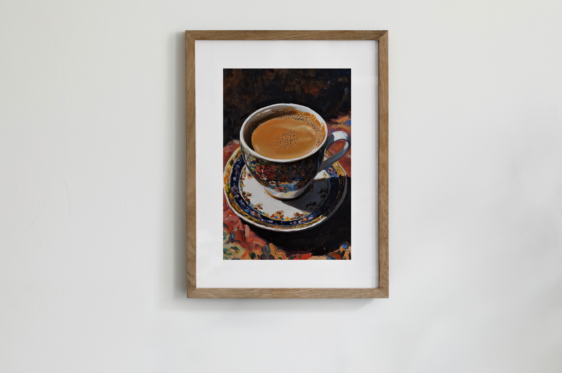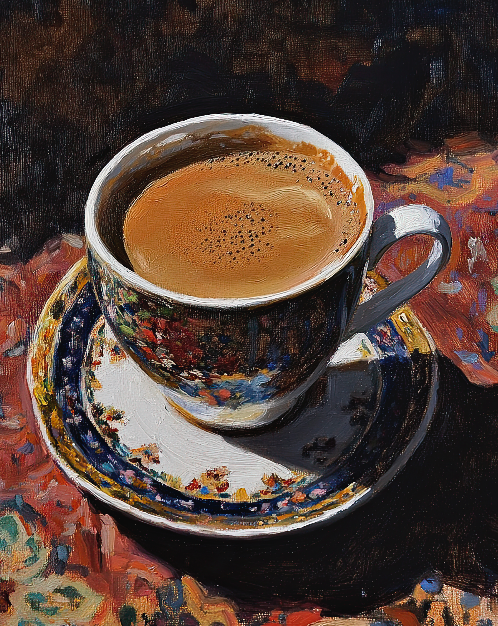 A steaming cup of coffee rests on a patterned saucer, surrounded by colors that echo tradition and comfort.